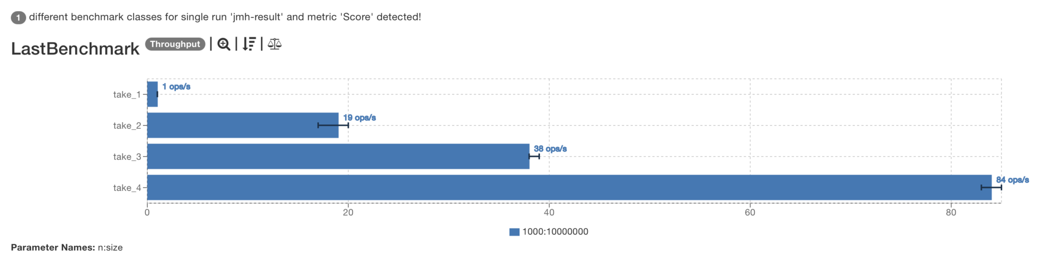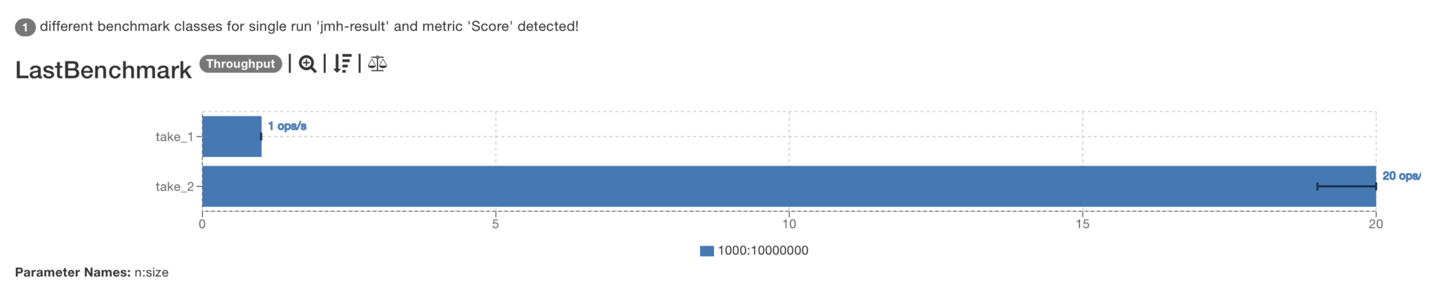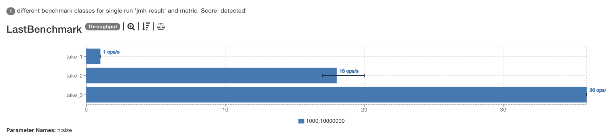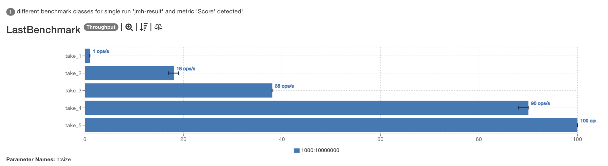 Benchmark (n) (size) Mode Cnt Score Error Units LastBenchmark.take_1 1000 10000000 thrpt 3 1,338 ± 0,239 ops/s