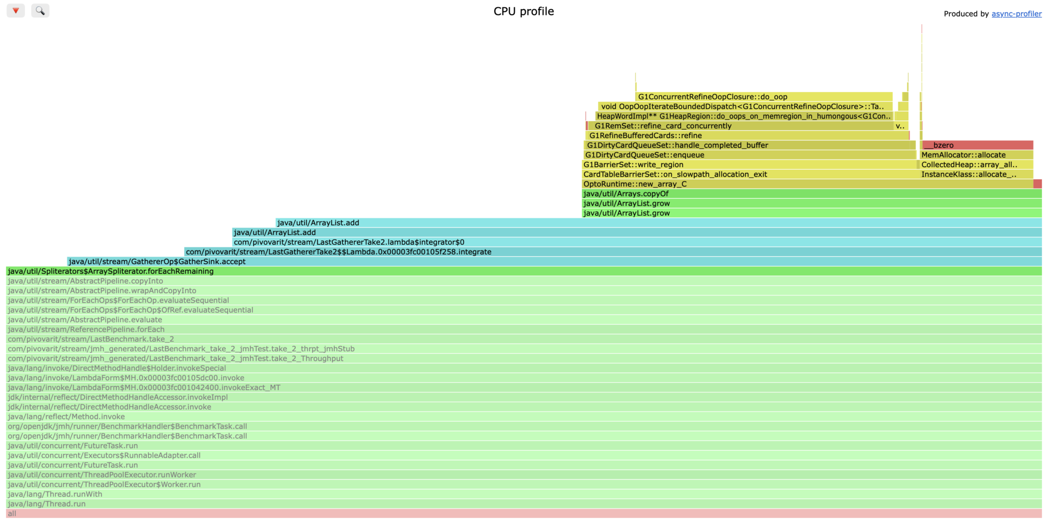 Flamegraph has also drastically changed, now it’s the ArrayList.add method that dominates, and we can see that this is mostly due to internal ArrayList.grow method that internally allocates a larger array (roughly 1.5× the previous size) and copies all existing elements into it (arrays can’t be resized).
