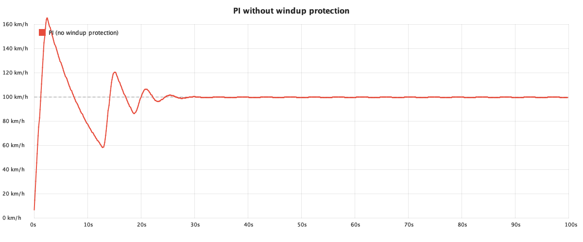 When the car reaches 100 km/h, the integral has grown huge. Even though the error is now zero, the accumulated integral causes massive overshoot. The controller then has to offload (or rather unwind) all that accumulated integral.