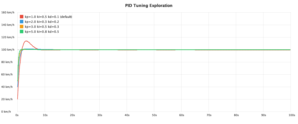 Let’s see what a difference tuning makes for our cruise control. Here are four parameter sets, all using the same PID controller: