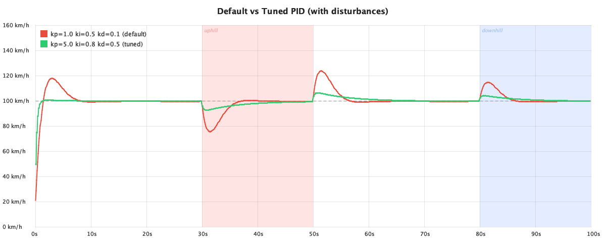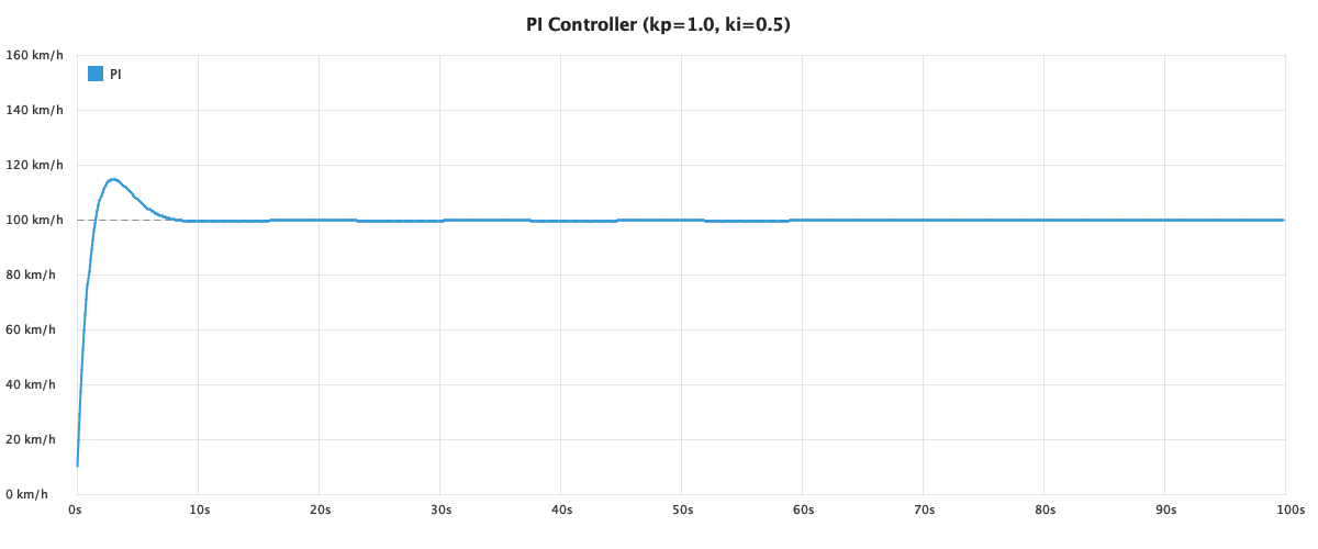 }Whoa! This actually works! Our car actually reaches 100km/h! Our integral makes sure that as long as there’s error, throttle adjusts, so the controller never settles below/above the target.
