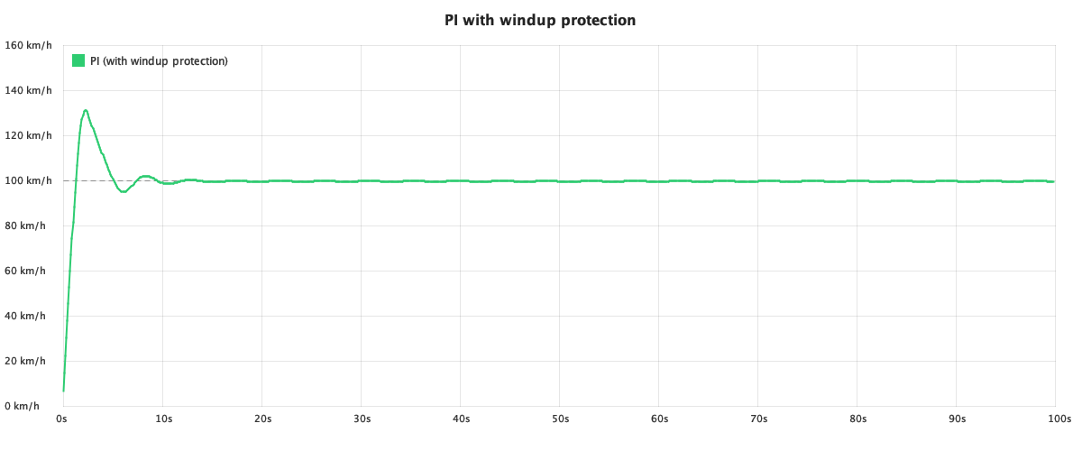 When the car reaches 100 km/h, the integral has grown huge. Even though the error is now zero, the accumulated integral causes massive overshoot. The controller then has to offload (or rather unwind) all that accumulated integral.